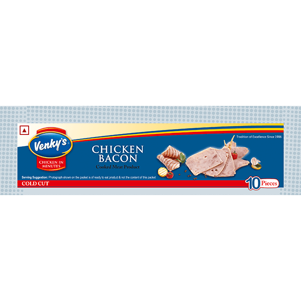 Thaw the packet Containing Venky’s Chicken Bacon in refrigerator at 6 to 8 degrees centigrade for 4-6 hours or thaw in a microwave. It is ready to use as cold cut, in salads and sandwiches OR It can be shallow fried in a nonstick pan with very little oil to achieves a minimum product temperature of 75 degrees centigrade