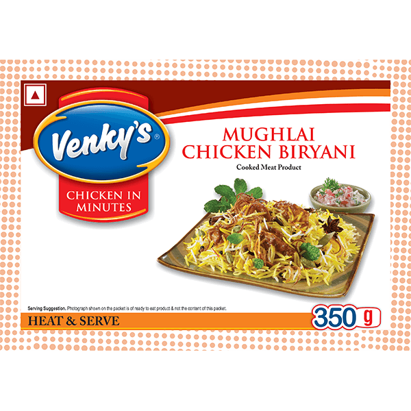 Cut open the pouch and microwave the sealed tray for 8 to 9 minutes OR place the sealed tray into a cooker & steam it for 16 to 18 minutes OR thaw the tray for 120 minutes at 5 degrees centigrade or less in a refrigerator, open the tray and place the Mughlai Chicken Biryani on a non stick pan & heat it on medium flame for 6 to 7 minutes. Product should achieves a minimum temperature of 75 degrees centigrade. Serve hot ready to eat Mughlai Biryani with Raita or Salan.